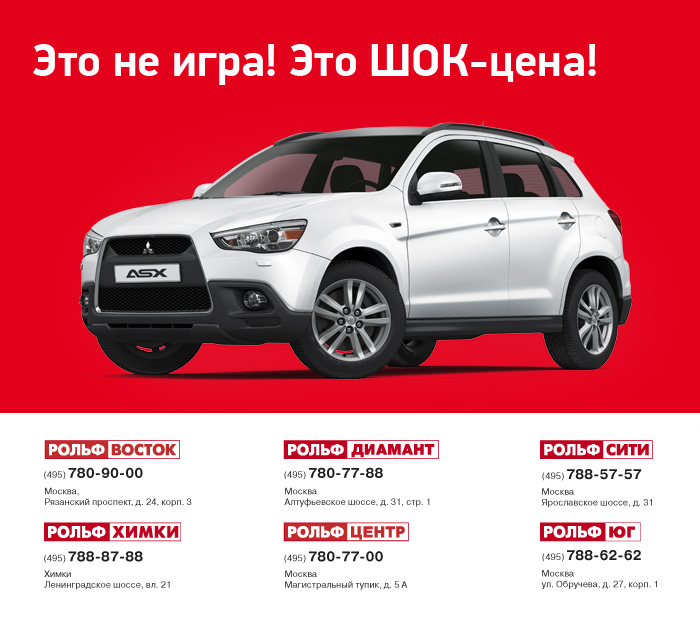 Это не ИГРА! Это ШОК-ЦЕНА! Акции Акции и специальные предложения в дилерских центрах «РОЛЬФ»Ваш браузер не потдерживает плавающие фреймыЭто не ИГРА! Это ШОК-ЦЕНА!07.11.2012Только вPРОЛЬФPвесь ноябрьPШОК-ценаPнаPMitsubishi ASX!Ваша выгодаP30 000 рублейPиPКАСКО*Pза наш счет!Скорость имеет значение! Самым быстрым -Pдоп. оборудование в подарок!P* Только при покупке КАСКО в ДЦ РОЛЬФ. Возмещение стоимости происходит за счет предоставления специальной цены на автомобиль и не может превышать 50 000 рублей.